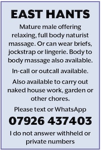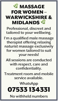WEST MIDLANDS Steve (70) seeks lady for regular mutual sensual massage. Please text replies or leave a message on 07746 040823
