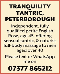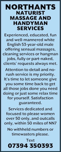LOVELY, OLDER LADY, 75, offers naturist, intimate, fbsm. Clean, discreet, ground floor flat. Wetroom and easy parking. Very friendly, welcoming and unrushed. Four-hand also available. Northampton, 5 mins from J15A. 07462 534190.