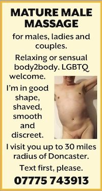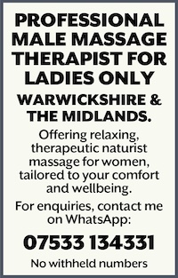 COTSWOLDS Male sensual erotic masseur, based near Cirencester, offers full-body massage to females and couples only. Allow yourself to relax as I take care of all your needs with my experienced touch. Let my hands glide effortlessly over your naked body with my essential oils soothing your stress away. To discuss an appointment, please call Mike: 07425 325334
