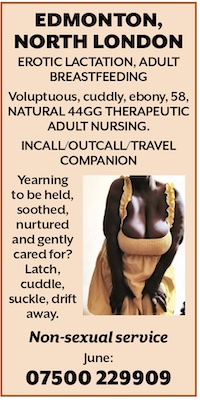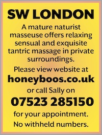 ALEXA, OF WEST LONDON (mid-70s) offers physically pleasing massage. Wine buffs welcome. Lunch with extended daytime booking available. Inquiries by text only please to 07507 371106.