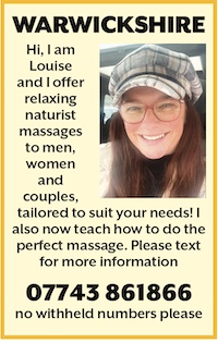 SWADLINCOTE, SOUTH DERBYSHIRE English, mature, toned, qualified masseuse, now offering a sensual naturist massage to tease and tantalise your senses. Come and indulge yourself in my private studio. Male grooming also available. Call Karen on 07910 401847. Withheld numbers will not be answered.